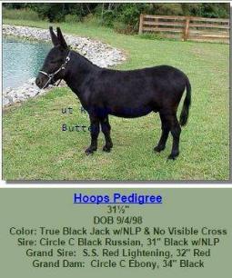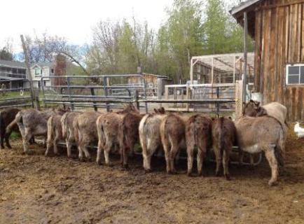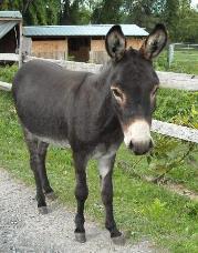 Donkeys need to be watched closely because they can become over cut back on the amount of feed they are getting. A bale of hay can weigh up to 50 pounds-but if you cut the bale twine that holds it together, it will separate into precut blocks called "flakes." Most people will feed a flake of hay in the morning and a flake at night. We recommend feeding by weight. You should feed between 1-2% of the donkeys body weight. We typically feed at a rate of 1.5% and this way we can adjust up or down depending on the donkeys weight. Miniature Donkeys do not require grain, and will become overweight if given grain or treats. They should not be on pasture for more than an hour a day, and even that might prove to be too much. Click here to read this article that show s donkey that has been over fed and has a broken crest. Please be aware of your donkeys weight so this doesn't happen to your donkey. Provide a salt and mineral block. They should be kept in a dry place and be available to the miniature donkeys at all times. Leave fresh water out for the miniature donkey to drink at all times. Check the water twice a day to ensure it is clean and that no dead insects or algae are floating in it. They should always have shelter from rain, snow, wind, hot sun, and flies! It should be dry and draft-free. Fencing need only be four feet high, woven wire is considered a safe and popular choice. Donkeys can withstand cold temperatures as long as they have shelter and are fed properly (extra hay not grain) in really cold weather. Miniature donkeys are "herd" animals. To avoid undue stress and loneliness, it is strongly recommended they not be kept singularly but with another Miniature Donkey or other animal as a life-long friend. Always remove the halter before leaving your miniature donkey. The Miniature Donkey is a compact, well-proportioned animal with a sweet, sociable disposition. At maturity (3 years), it is able to pull a cart or carry a pack as it did in its native Sicily and Sardinia |